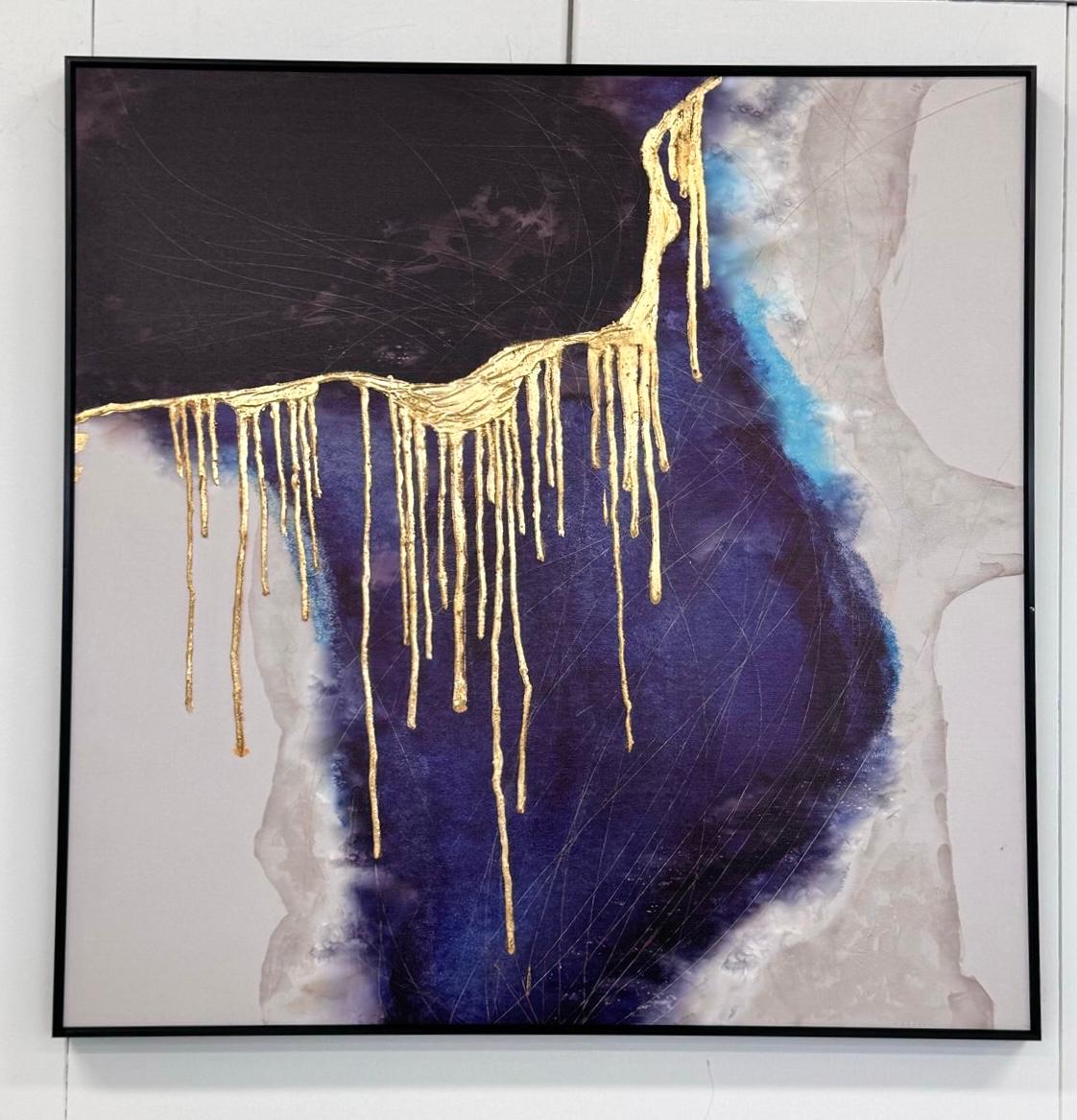 • Striking blue and black abstract wall art with dripping gold foil accents.