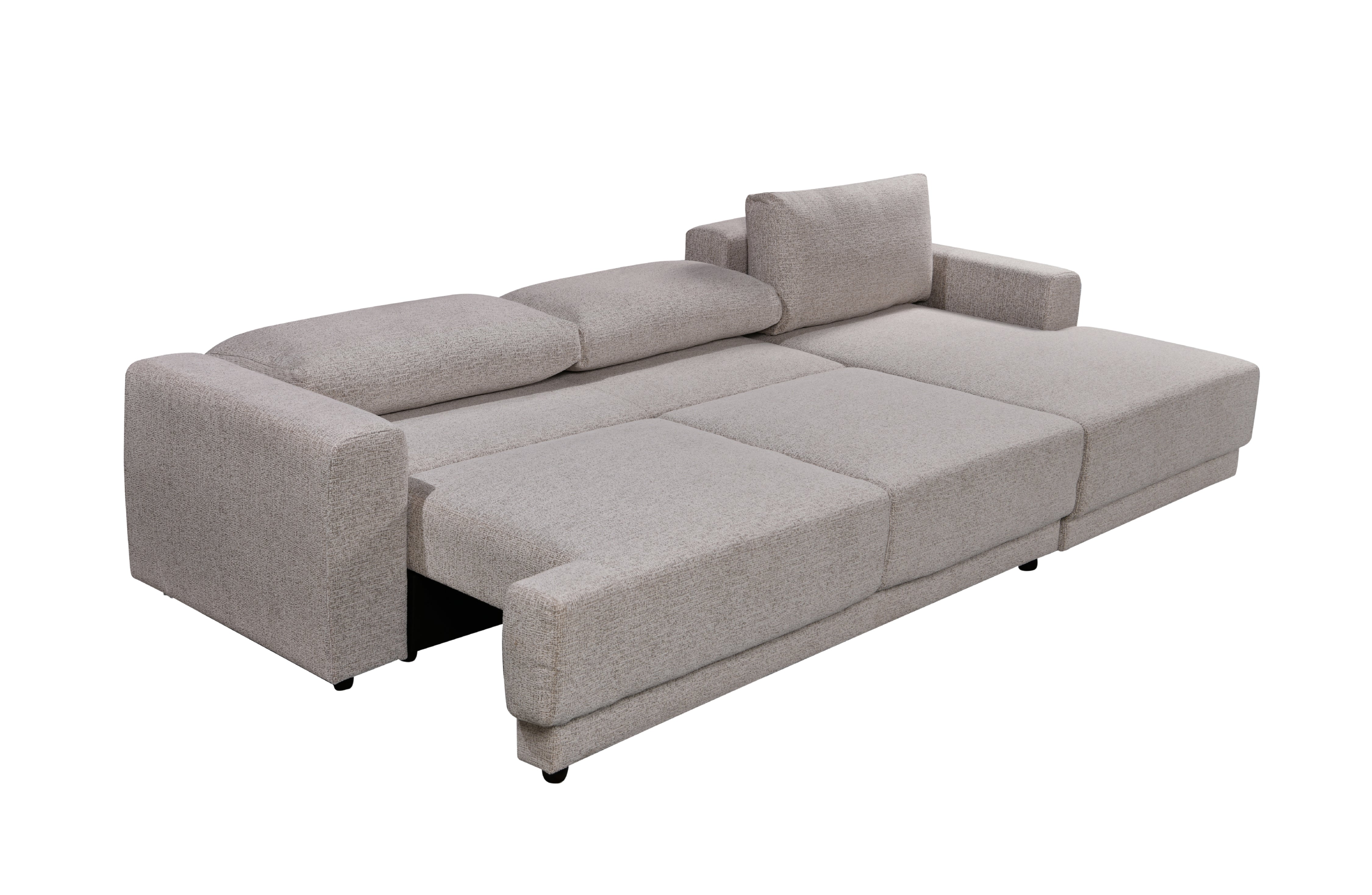• Spacious beige L-shaped Nora chaise lounge with hidden bed – perfect blend of style, comfort, and functionality