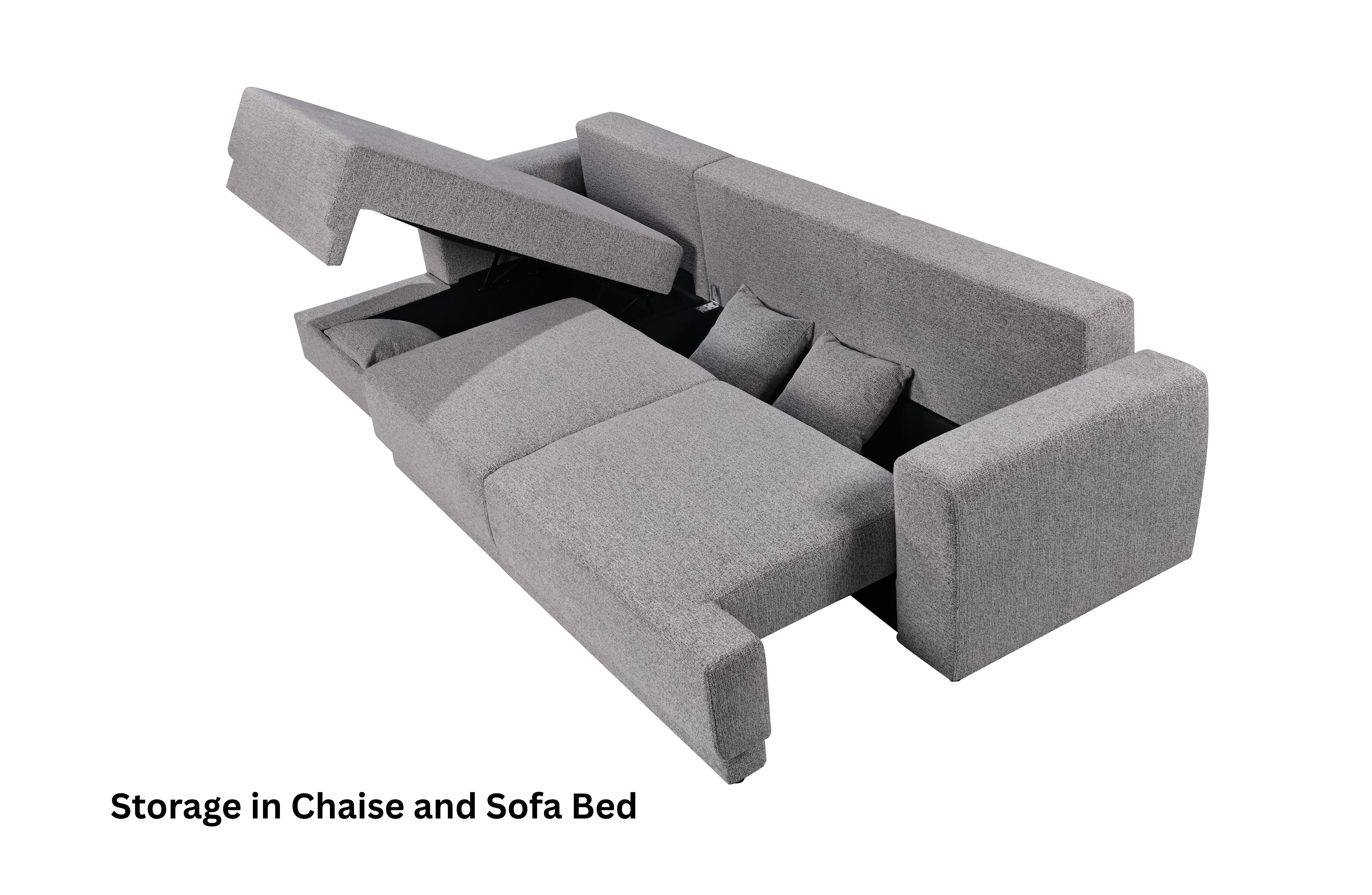• Lift-up storage in Nora chaise lounge and sofa bed – perfect for stashing blankets, pillows, or daily essentials