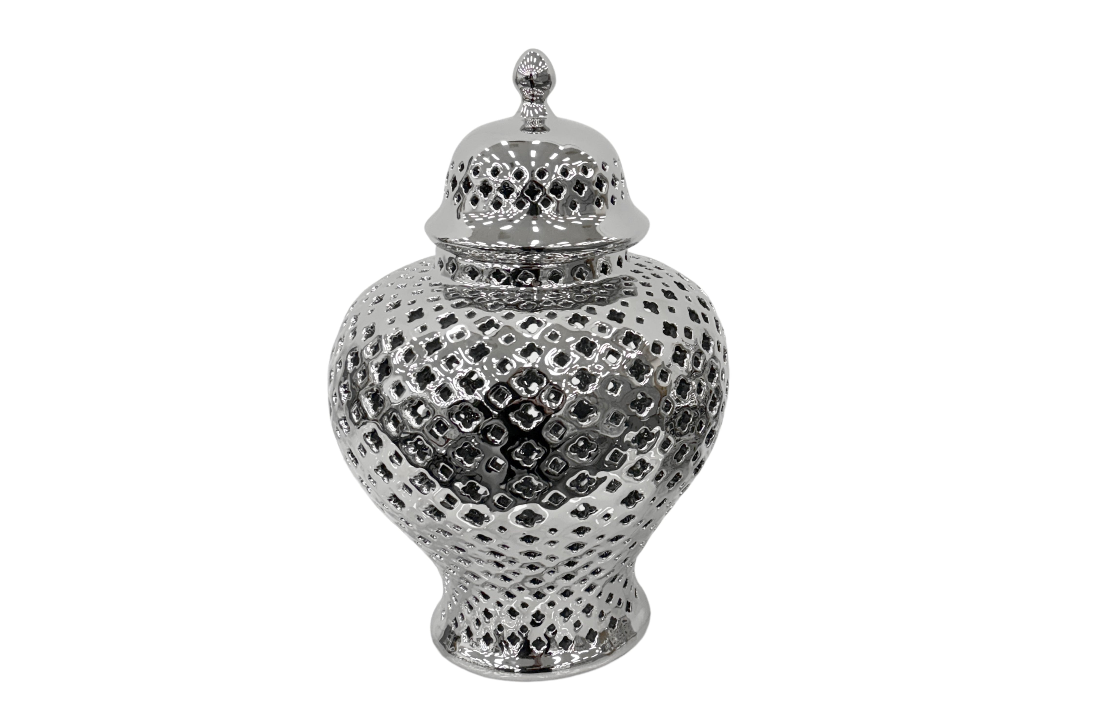 Small silver Hampton Urn with shiny pierced ceramic body, perfect for tabletop or shelf styling.