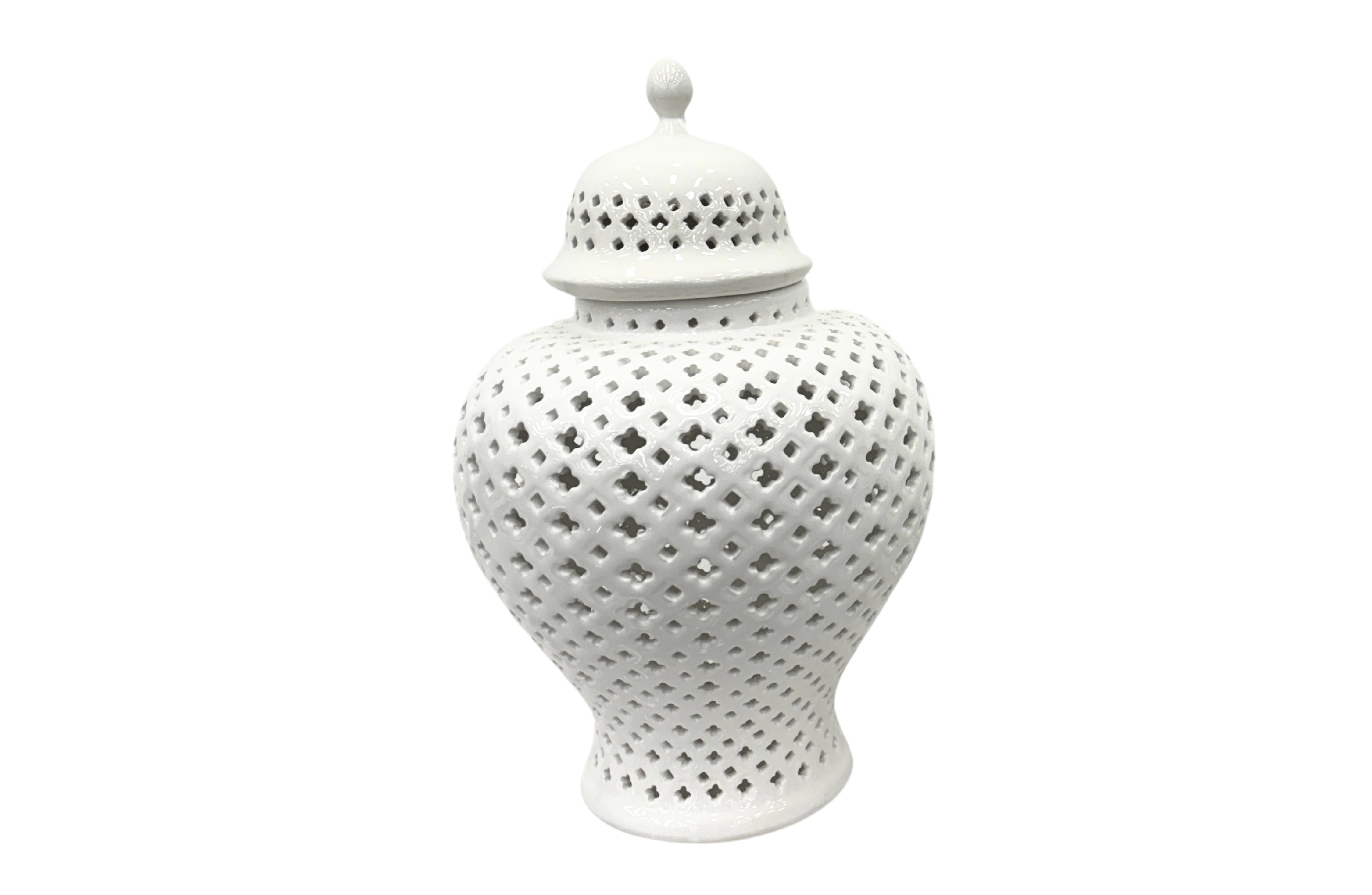 • Elegant white ceramic Classic Hampton Urns in large and small sizes with pierced latticework, ideal for refined home styling.