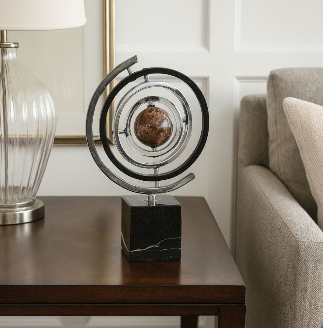 • Sleek black and gold globe décor with marble base – a refined modern accent.