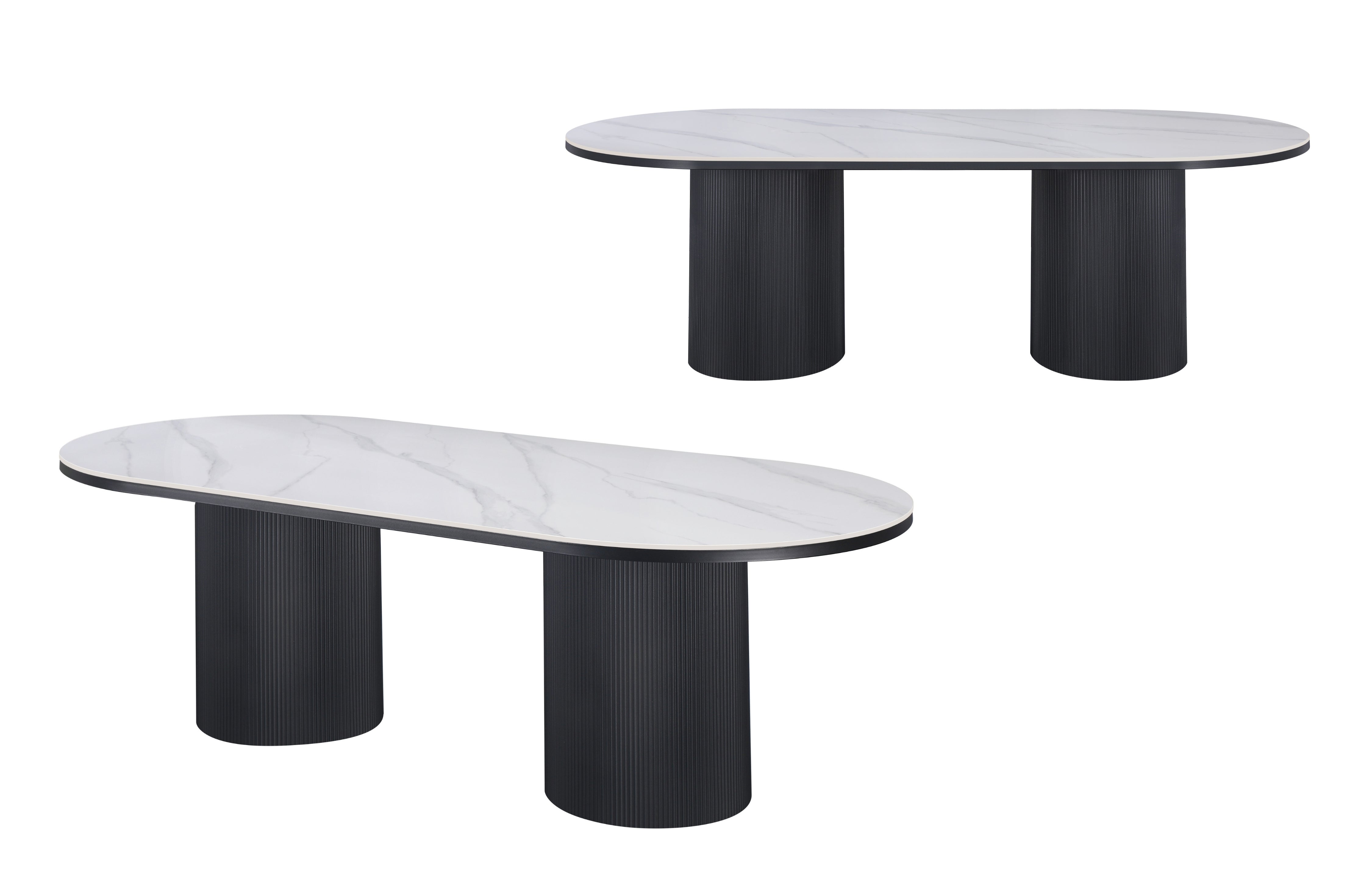 White marble oval dining table with black fluted base creating bold modern luxury centrepiece