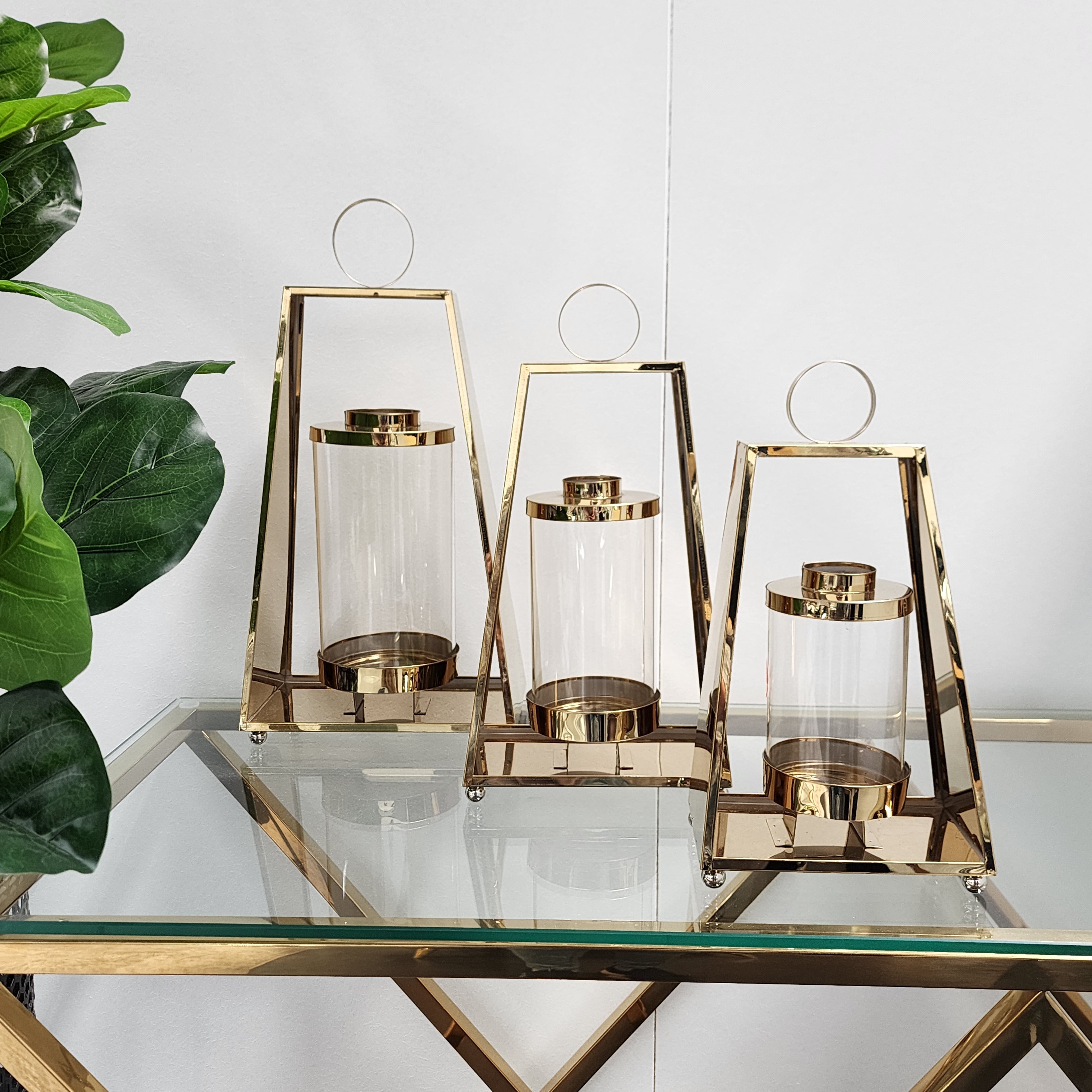 Gold tear-shaped lantern set displayed on glass table – modern and luxurious design